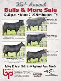 Our annual "Bulls and More" sale is held the first Saturday in March. Yearling and long-yearling bulls, bred cows and purebred pairs will be offered along with small sets of commercial open heifers as they become available.